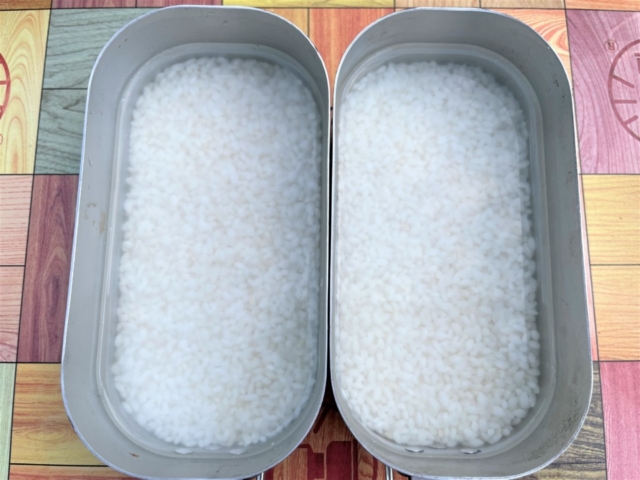 今回はキャンプ場で作ったので、起床=米の吸水作業でした。お米を20分ほど吸水させます。