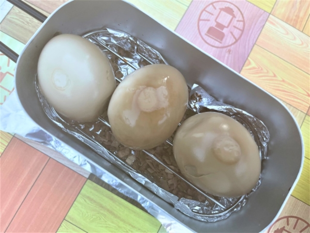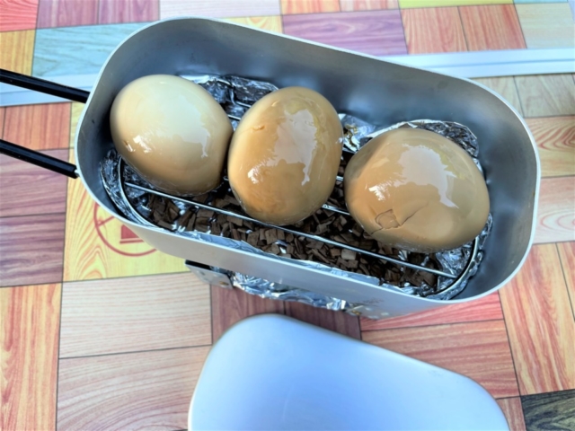 事前にゆで卵をタレに漬け込んでおいて、現地で燻製にするだけ!