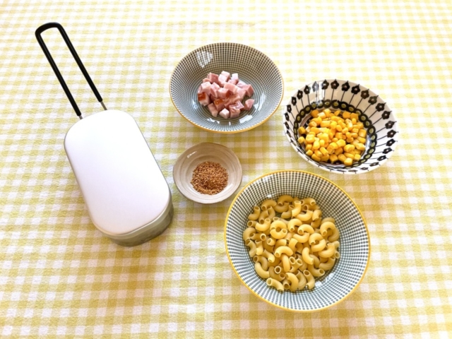 マカロニ(15g)、水(300ml)、ベーコン(20g)、コーン(お好みの量)、コンソメ(小1)