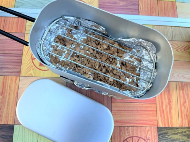メスティンにアルミを敷いて、その上に燻製用チップを入れます。
