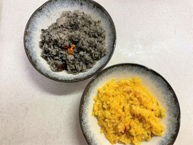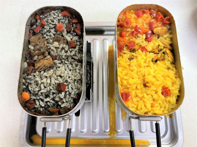 イカスミパエリア(左)とシーフードパエリア(右)は大人にはウケが良かったのですが、我が家の小学生ボーイズには不評でした。