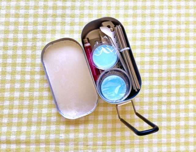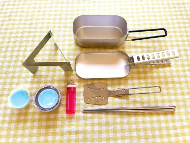 今回は材料以外の、五徳、固形燃料、ライター、ミニ折りたたみターナー、クッカークリップ、箸を入れてみます。