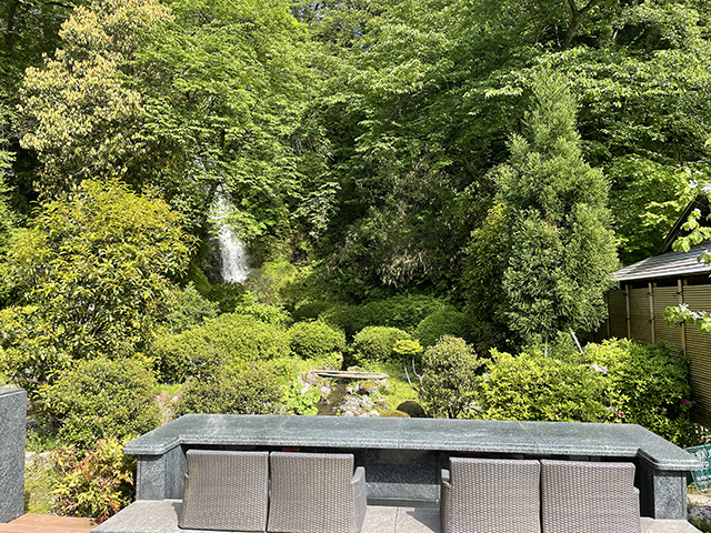 滝の音や川の流れが心地よく響き、滞在中は自然の音に癒されます。ラウンジからは庭の景色が、各部屋からは美しい自然を楽しめます。
