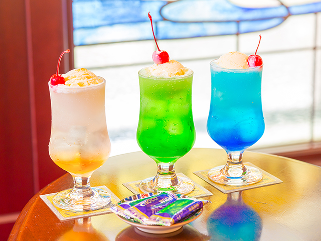 ステンドグラスに映える、クリームソーダ <画像提供:金沢白鳥路 ホテル山楽>
