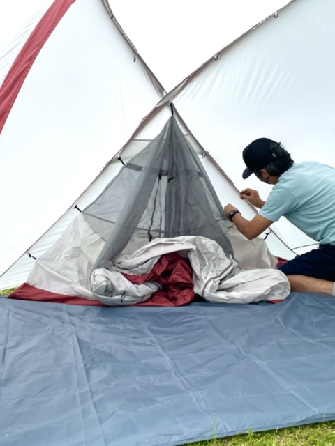 ⑤最後にインナーテントを完成させます。テントの内側で、アウターテントの内側ジョイント部分に接続したら完成です。