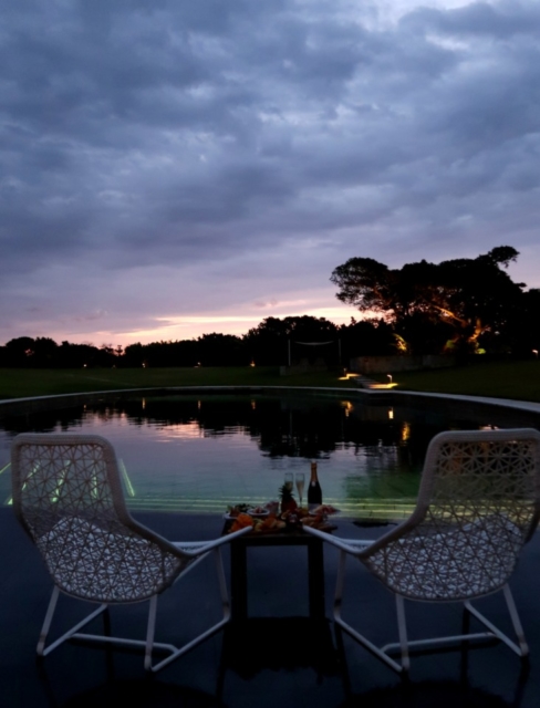 まず、ロケーションが素晴らしい。静かな早朝のプールを貸し切り、浅瀬には朝日が昇る東の空に向けてテーブルがセッティングされます。この特等席に並ぶのは、夏に旬を迎えるマンゴー、パッションフルーツ、ドラゴンフルーツなどを中心に、生ハム、チーズ、エビのカクテルやローストビーフ、サラダといったボリュームたっぷりの内容。さらに、ソムリエがセレクトしたシャンパンは、フルーツとの相性の良さで選ばれたもの。完熟フルーツを思わせる甘い香りと繊細な泡立ちが、朝のシャンパンタイムをいっそう盛り上げてくれます。