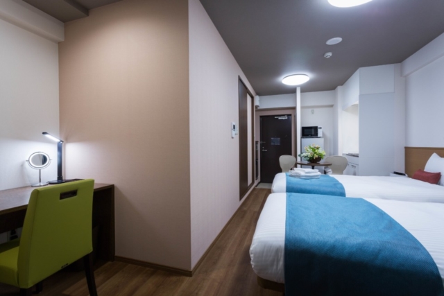 L字型の客室にワイドデスクを設置したトラベラーズツイン