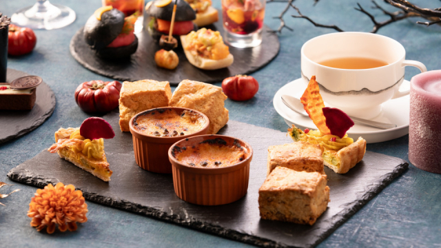 コンラッド東京は、9月1日(金)よりバー&ラウンジ「トゥエンティエイト」にて、麗しい秋色スイーツ5種と季節の味覚を閉じ込めたセイボリー3種が、アンティークブックとドライフラワーに象徴されるようなノスタルジックな世界観の中に並ぶ「アンティーク・ハロウィンアフタヌーンティー」を提供します。