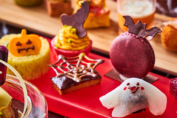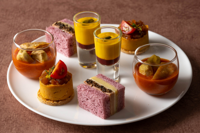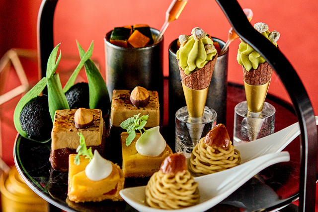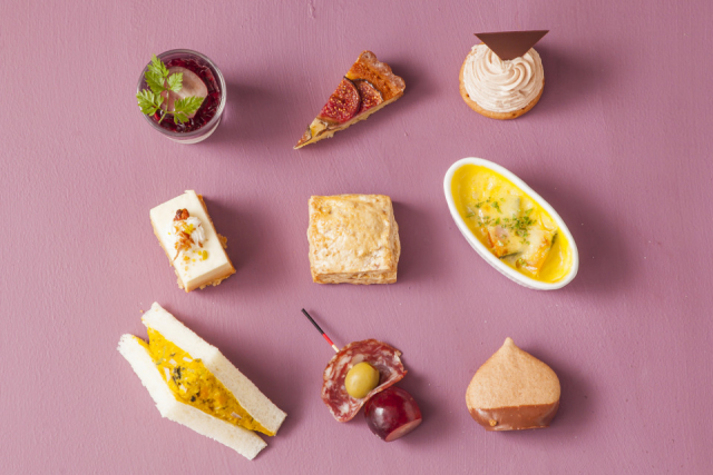 秋の味覚であるさつまいもやかぼちゃ、栗などを随所に散りばめた秋の訪れを存分に楽しめるアフタヌーンティーに仕上げました。プティフールでは、上品で控えめな甘さが特徴の和栗を使ったワンスプーンサイズのモンブランや、クランチにした竹炭クッキーの衣を纏った紫芋クリームの、絶妙な食感とハーモニーなど楽しめます。