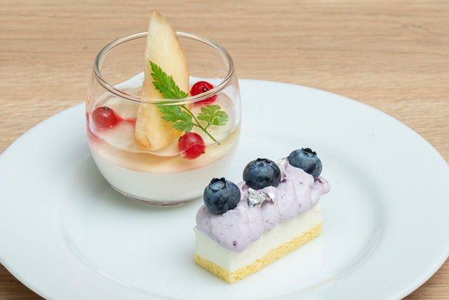 プティフールは桃とヴェルヴェーヌ(ハーブ)を合わせた、爽やかな「桃とヴェルヴェーヌのヴェリーヌ」や、バナナにスパイスを合わせ、香りのアクセントが効いた「バナナとエピスのケーク」などを用意。セイボリーは、はまぐりの旨味と香りが口いっぱいに広がる、口当たりの良い「九十九里地蛤のロワイヤル 焼ばら添え」や、メロンの甘さの中にレフォール(西洋わさび)のピリッとした程よい辛味のある「千葉県産メロンとキューリのスープ レフォールクリーム添え」などを楽しめます。