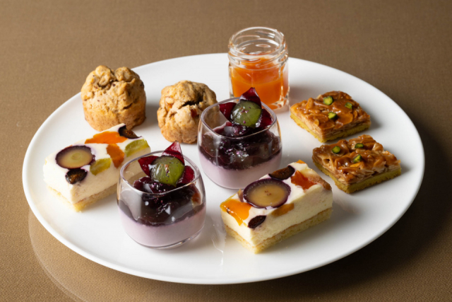 都会の中でも自然豊かな御殿山で、四季の移ろいを感じながらお楽しみいただく東京マリオットホテルのアフタヌーンティー。秋のテーマは旬の食材が豊富な実りの秋をイメージした「Autumn Fruits Basket」。秋を代表するフルーツのぶどうを主役に、栗や柿・紫芋など秋に旬を迎える食材をふんだんに用いたスイーツ・セイボリーがテーブルを彩ります。