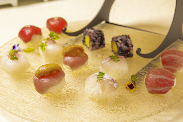 実り豊かな秋の季節。寿司職人が大トロやカレイなどのネタに加え、かぼちゃや蓮根など秋の食材をアレンジした手毬寿司や季節のデザートプレートをアフタヌーンティースタイルで提供します。