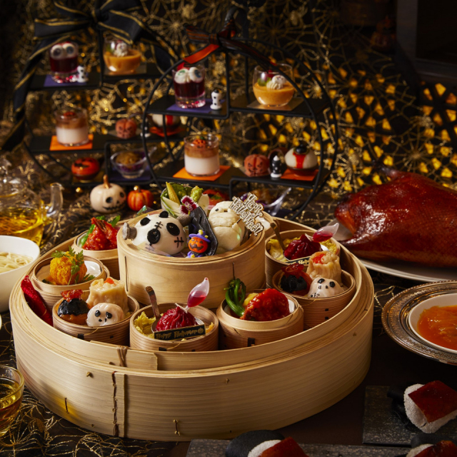 「桂花苑」では、「チャイニーズハロウィンアフタヌーンティー」が初登場!豚肉とトマトの旨みが口いっぱいに広がる、真っ赤なショーロンポーは、スポイトに入った赤酢をかけながら楽しむ一品です。また、ガイコツに見立てた蒸し餃子や、旨みが凝縮された中国サラミに、包帯に見立てた生地を巻き付けてミイラ男を再現したポークロール花巻など、大きなセイロにはカラフルでハロウィンモチーフあふれる点心がラインナップします。