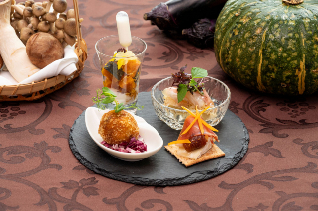 スイーツのひと品「カボチャのキャラメリーゼ風」は秋の三大味覚であるカボチャをひと口サイズにカットしてメープルシロップに浸し、オーブンで繰返し火を入れ用意。アクセントには、ほろ苦い「カカオニブ」をあしらいスポイトに用意したヨーグルトと合わせて楽しめます。