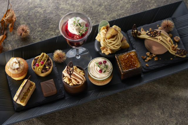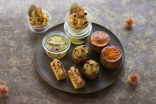 スイーツは、巨峰とシャインマスカットから溢れ出す果汁と濃厚なフロマージュブランのバランスが絶妙な「葡萄とチーズのヴェリーヌ」や、くるみのビスキュイの上に白無花果のクリームとかぼちゃのムースを重ね秋の贅沢を詰め込んだ「無花果とかぼちゃのムース」、幾重にも渦を巻き十字架とコウモリをあしらった「抹茶と栗のロールケーキ」など、旬の味わいを大切にしながら、魅惑的な香りと遊び心を添えた7種を用意しています。