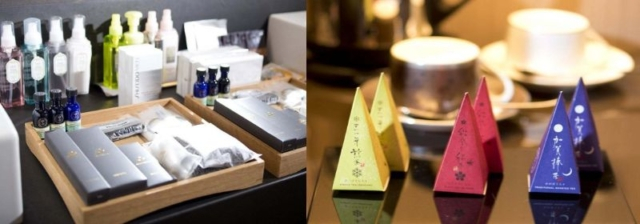 基礎化粧品はデタイユ・ラ・メゾンや資生堂など上質ブランドを採用。右は能登紅茶や加賀棒茶のセット