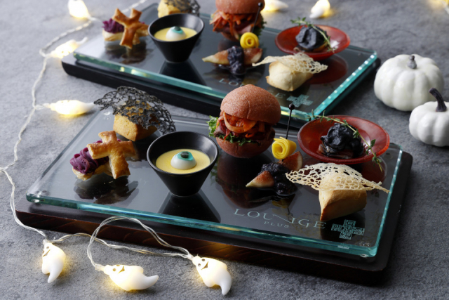 遊び心感じるシックな色合いのハロウィーンアフタヌーンティー。柿やイチジク、かぼちゃなど秋の食材をふんだんに使用した見た目も味も楽しめるメニューです。