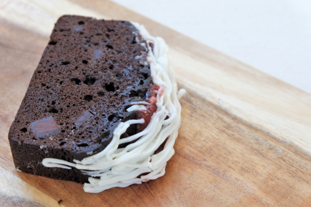 食べてみると、底の方に入っているちょっとビターなチョコレートチャンクや、真ん中あたりに練りこまれているとろりとしたチョコレートフィリングの味わいが美味しい!パウンドケーキ部分はチョコレート味ではなくバニラ風味なので、練りこまれているチョコレートの味わいをよりしっかりと感じることができます。