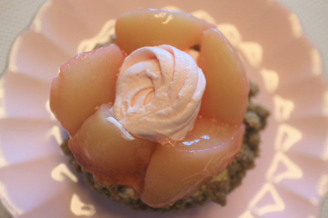 アールグレイの香りがしっかり立つスポンジに、まろやかなピーチ風味のクリームがたっぷり乗っています。まわりにはザクザクとしたクランブルも散りばめられており、食感も楽しめます!