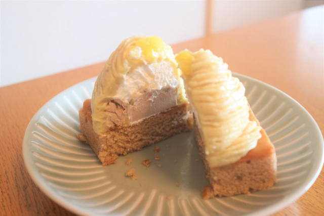 ふんわりとしたマロンスポンジ生地に、栗の甘露煮が入ったマロンムース、ホイップクリームが乗り、なめらかなマロンクリームで包まれています。 溶けるようなクリーミーさで、あっという間に食べてしまいました…!
