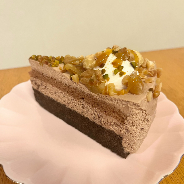 冬に食べたくなるチョコレートケーキの上に、香ばしく食感の楽しいナッツがごろごろと乗っかっています!チョコ×ナッツの相性は言うまでもありません。