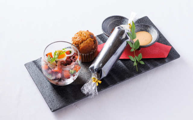 2段のお弁当箱には、あんぽ柿を抹茶ホイップでサンドしたスイーツや、べっこう餡にオリーブオイルを加えたチーズ豆腐など和と洋を融合させたメニューが並びます。グラススイーツのチョコ林檎ゼリーは、まるでフルーツポンチのような新食感を楽しめます。