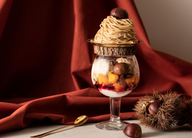 和栗のペーストをふんわりエスプーマで仕上げたモンブランがのった秋らしいパフェメニュー。グラスの中には、マリネされた柿や渋皮つきの栗のグラッセなどがぎっしりはいっています。