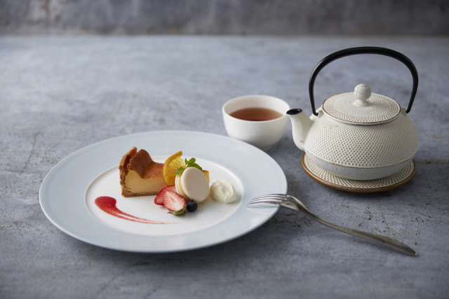 カフェメニューのおすすめは、果物やマカロンなどがそえられたNYチーズケーキ。鉄瓶で提供される紅茶はたっぷり約2杯分ありました。