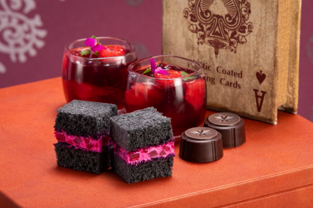 「ビーツとクリームチーズ チャーコールブレッドサンドウィッチ」など、テーマカラーの赤と黒を基調としたビジュアルでアリスの世界観を表しています。