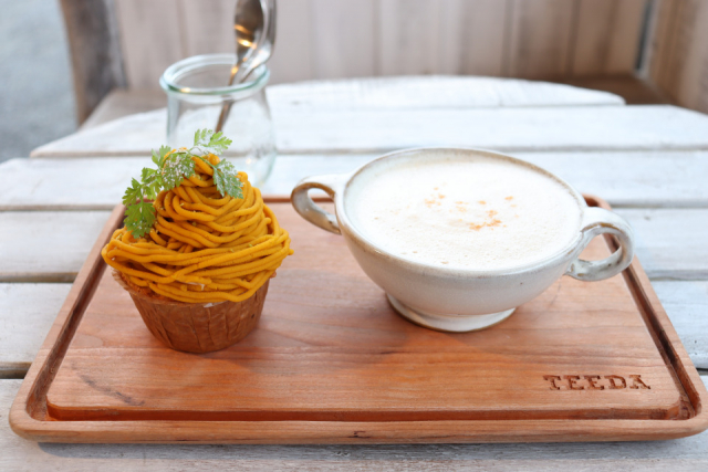 かぼちゃのモンブラン550円(期間限定)、豆乳ホットきなこラテ550円