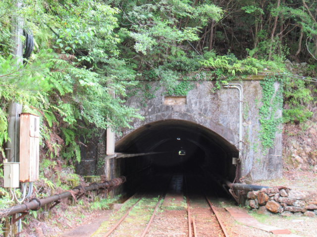 瀞流荘駅を出ると、すぐ3号トンネル(272m)に入る。扁平な形のポータルには、複線の線路が残っている。実は、トンネル途中で分岐があり、そこから別のトンネルにもつながっている。この山中には地下鉄さながらの多くのトンネル軌道が通っており、鉱石を運搬するトロッコが頻繁に行き交っていたという。