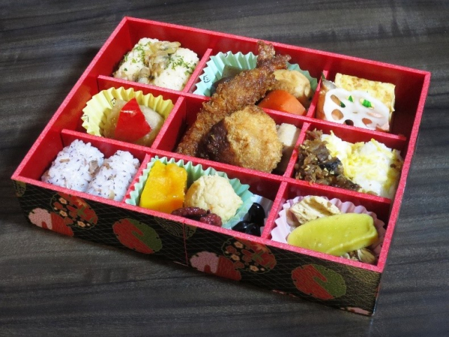 フタを開けると、華やかなおかずが行儀よく詰められていて、ワクワクします。