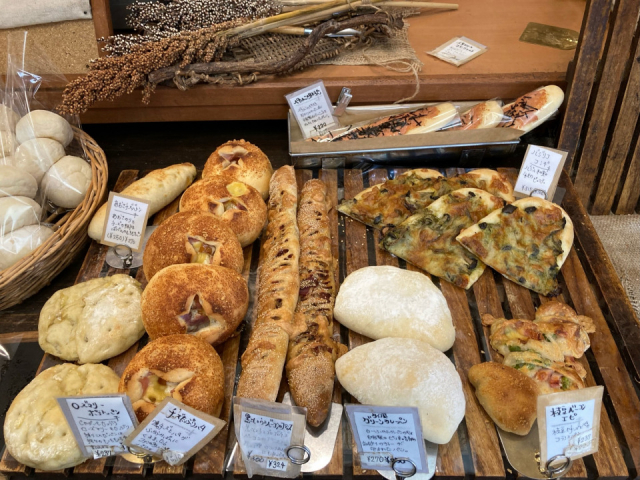 こちらのパン屋さんには、素材の旨味を存分に引き出したパンが並びます。写真右上のバジリコフンギのピザはシメジの味が活きていて絶品。枝豆ベーコンエピのパンもクセになる味わいです。