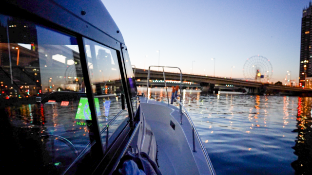 岸釣りも盛んなシーバス釣りですが、今回はシーバス船をチャーター。東京中央区の勝どき橋からシーバス船に乗り込み、ベテラン船長のガイドでボートシーバスに挑戦です。
