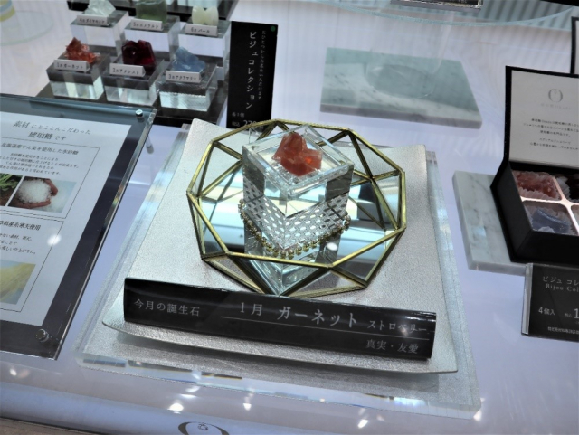 誕生石の姿に仕上げた色とりどりの12種類の琥珀糖が、まるで宝石店のショーケースのよう。色合いや形の美しさはもちろん、素材にもこだわっています。