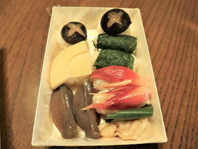もうひとつの看板メニュー「田舎寿司」は、高知の郷土料理。柚子酢を効かせた酢飯に、甘く炊かれたしいたけや、こんにゃく、みょうがやタケノコなど旬の野菜をネタにのせたお寿司です。