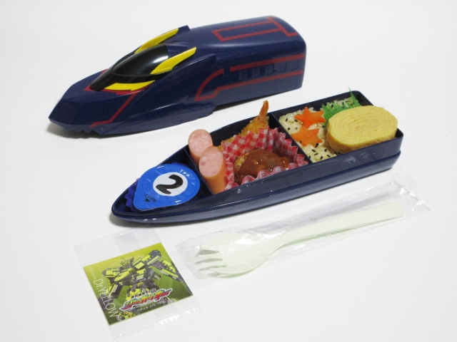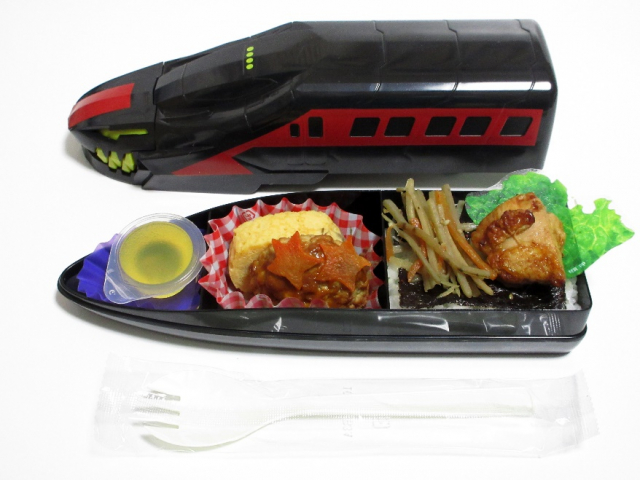「シンカリオン」からもうひとつ、こちらは新キャラクターの『ダークシンカリオン弁当』。赤と蛍光イエローを配した漆黒のボディ、イヒヒヒ……という声が聞こえてきそうな歯並びが、いかにも「悪役でござい」という体で、いい味を出しています。造形が凝っていて、オモチャとしての魅力度が高い商品。電子レンジは非対応です。