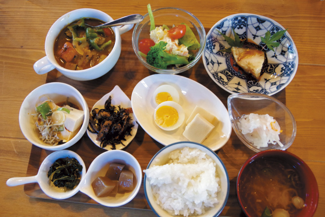 - 朝のとろろ汁膳=1380円/朝のおにぎり膳=1330円/卵かけご飯セット=1330円/男爵芋のコロッケ=600円/だし巻き玉子=580円/煮物の盛り合わせ=580円/