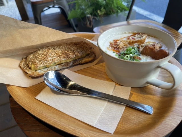 人気の台湾モーニング「鹹豆漿(シェントウジャン)」(550円)と台湾式サンドウィッチ「焼餅夾蛋(シャオビンジャーダン)」(330円)
