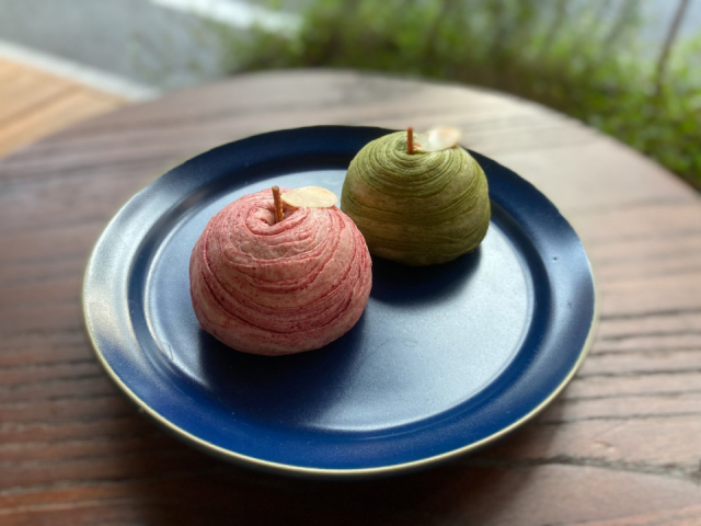 「酥(スー)」とは、サクサクしたという意味でパイ風の生地で餡を包み込み、焼き上げたお菓子のこと。ビーツで色付けしたパイ風生地の中には白餡とリンゴジャムがたっぷり入っています。