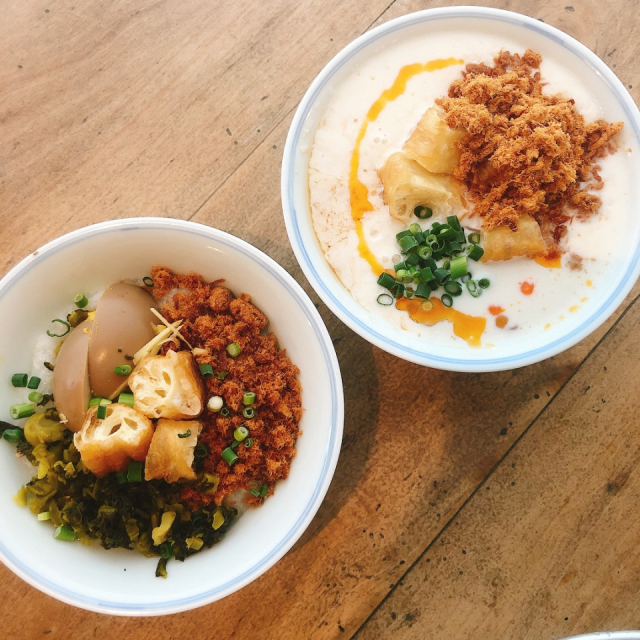 「肉鬆(ローソン)粥」(500円)(左)と肉鬆(ローソン)をトッピングした「鹹豆漿(シェントウジャン)」(650円)(右)