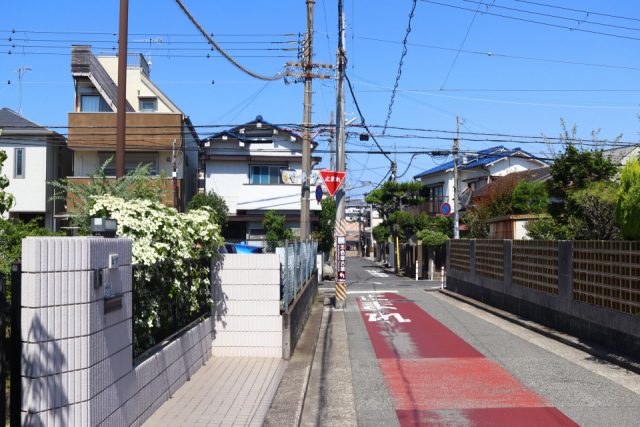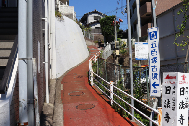 交差点から少し進んだ左手に「五色塚古墳」と書かれた看板と赤く舗装された道があります。ここからは少し途切れながらも、この赤い舗装路が五色塚古墳まで案内してくれます。