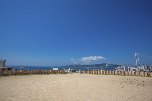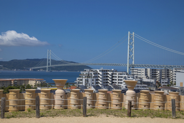 埴輪ごしに見る明石海峡大橋という、古代の遺跡と現代建築がコラボレーションした不思議が感慨深いです。営業時間が17時までなので、日没時間の早い冬季に限りますが、ここから見る夕日の美しさは格別だそうですよ。