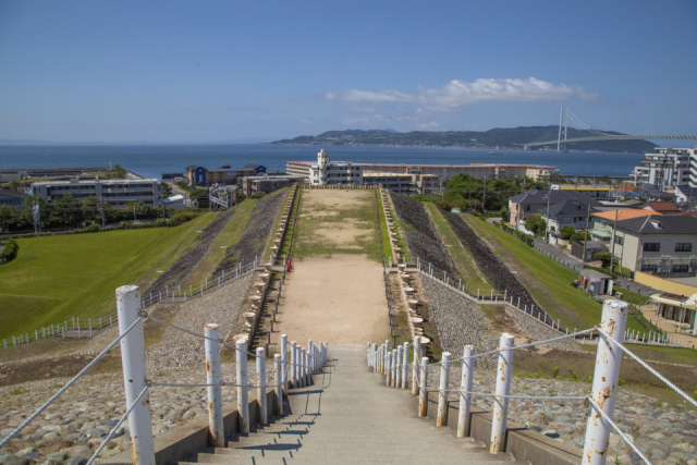 前方部分は広々とした長方形になっていて、周囲をぐるりと古墳が囲んでいます。明石海峡や淡路島を臨み、山陽電車やJRが街中を走る様子も見られます。行き交う船の汽笛まで聞こえる臨場感ある景色に、見とれてしまいます。