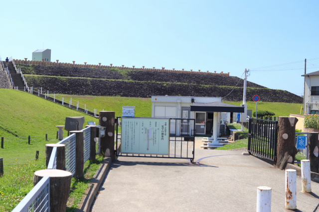案内にしたがって右手に進んでいくと、入口に到着! 後ろに見える白い建物が管理事務所となります。五色塚古墳は見学無料ですが、受付が必要です。名前などを記入し入園手続きをしましょう。五色塚古墳の詳細がわかるリーフレットもこちらでもらえます。