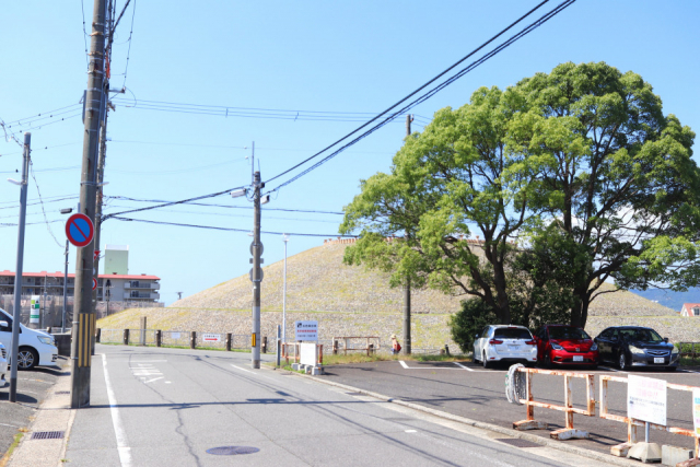 左折すると目の前に急に現れる大きな古墳! ずっと住宅街を歩いてきているので、こんなところに兵庫県最大の古墳があるのか、と驚かされます。大きな木の手前には、五色塚古墳見学者専用の駐車場もあります。車の人はこちらに停めて向かいましょう。