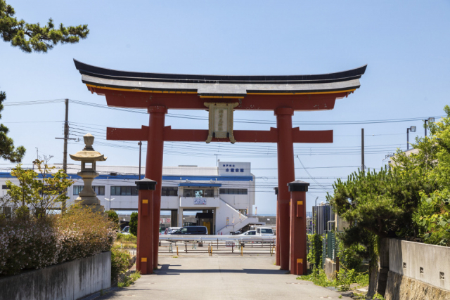 JR・山陽垂水駅から南へ徒歩1分という立地にある「海神社」は、平安時代に編纂された『延喜式』にも名があがる格式高い神社。約1800年前に神功皇后が上津綿津見神、中津綿津見神、底津綿津見神の綿津見三神を祀った場所に御社を建て、御神徳を仰いだのが鎮座の由来です。現在では、航海安全や漁業繁栄の神として信仰されています。