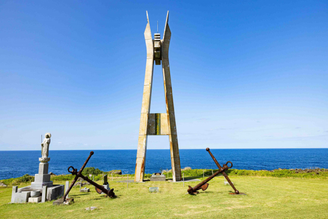 徳之島の西南部、東シナ海に突き出た琉球石灰岩の海蝕崖の岬。鋭く切り立つ断崖、紺碧の海、白く砕ける波が織り成す景観に圧倒されます。敷地内には、沖合で撃沈した戦艦大和の慰霊塔も立っています。