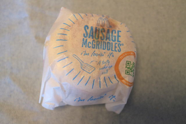 こちらは非常にシンプルなマックグリドル。甘いメープル風シロップ入りのパンケーキと、しょっぱいポークソーセージだけのシンプルな組み合わせ。