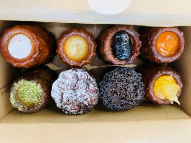 左上から、仏ゲランドの塩(季節のカヌレ)、しろ(プレーン)、黒豆きなこ、あんず、パイナップル(季節のカヌレ)、ほうじ茶、黒糖くるみ、抹茶あんこ。